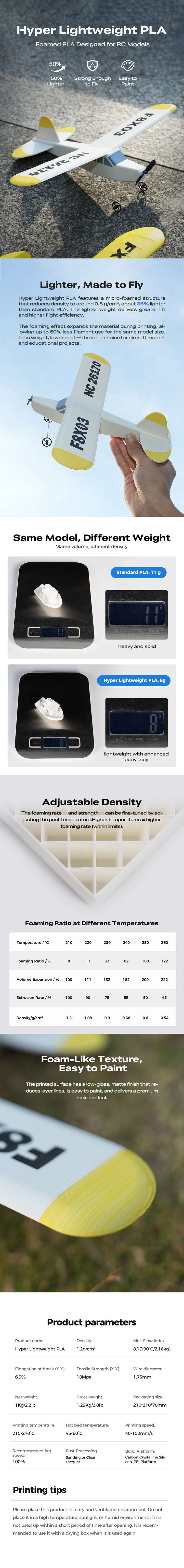 Creality Hyper Lightweight PLA (FOAM PLA olarakta geçmektedir) RC modeller için özel üretilmiş daha hafif PLA malzemedir.